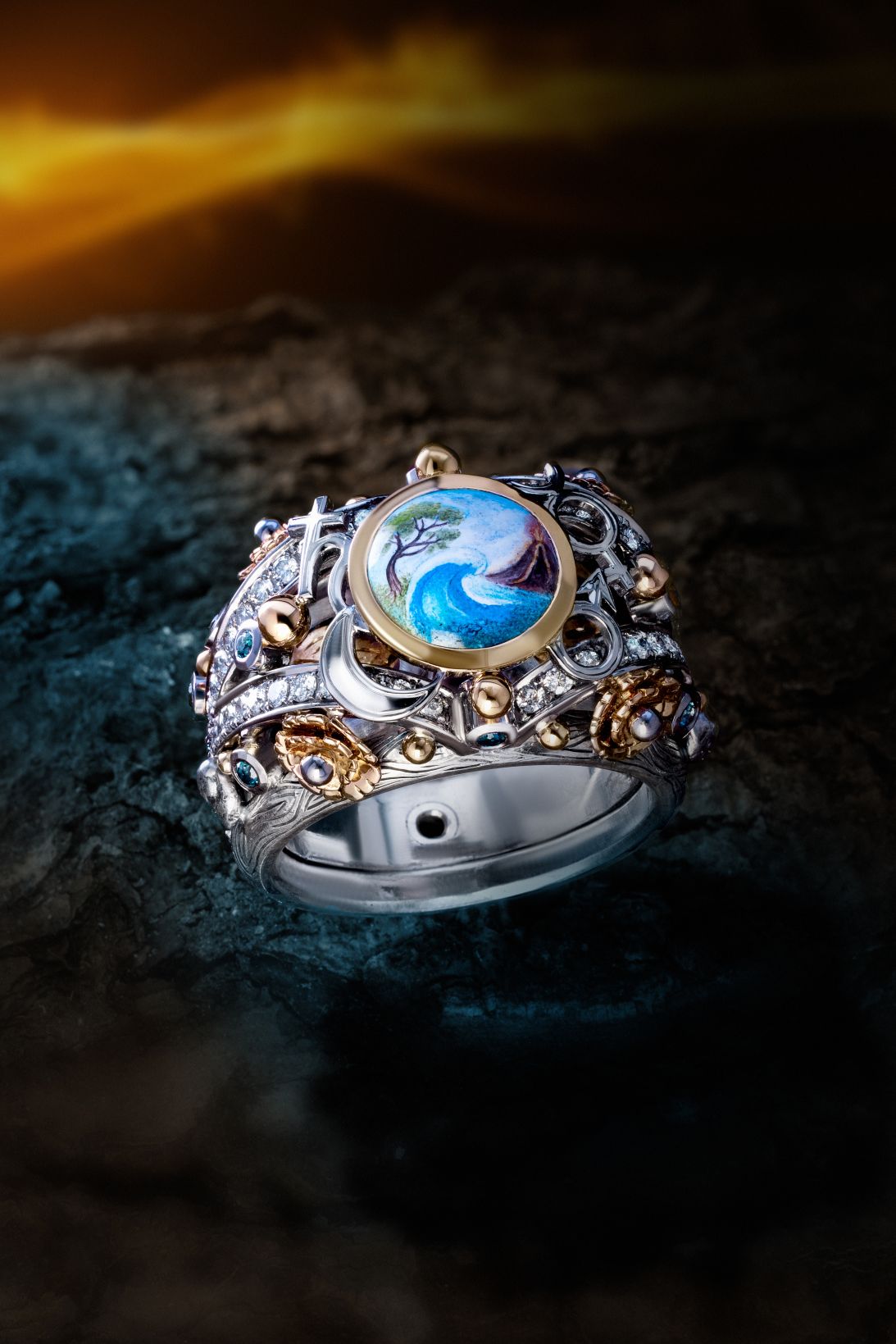 Der Preisträger erläutert seine kreative und handwerklich durchweg überzeugende Arbeit mit dem „ewigen Streben des Menschen, Harmonie zwischen Natur, Vernunft und dem eigenen Sein zu finden. Die rissige Erde (symbolisiert durch den Onyx) nimmt Wasser vom Himmel und aus Gewässern (symbolisiert durch die Saphire und Topase) auf und lässt durch das Zusammenspiel von Luft (symbolisiert durch Diamanten) und Feuer (symbolisiert durch Roségold) mit den pflanzlichen Elementen des Ringes (symbolisiert durch Äste mit Blüten) neues Leben entstehen. Dabei wird die philosophische Bedeutung des Schmuckstückes durch alchemistische Symbole der Planeten, Schutzpatrone der Elemente – Saturn, Mond, Merkur und Mars – verstärkt.“ Jurymitglied Maja DuBrul honorierte insbesondere die Vielschichtigkeit dieser aufwendig gefertigten Wettbewerbsarbeit. „Auch die Form dieses detailreichen Rings überzeugt mich und dass es eine leere und abstrakte Kette um den zentral angeordneten Stein gibt, die ihn in besonderer Weise hervorhebt und in Szene setzt.“ Die Jury entschied mehrstimmig.