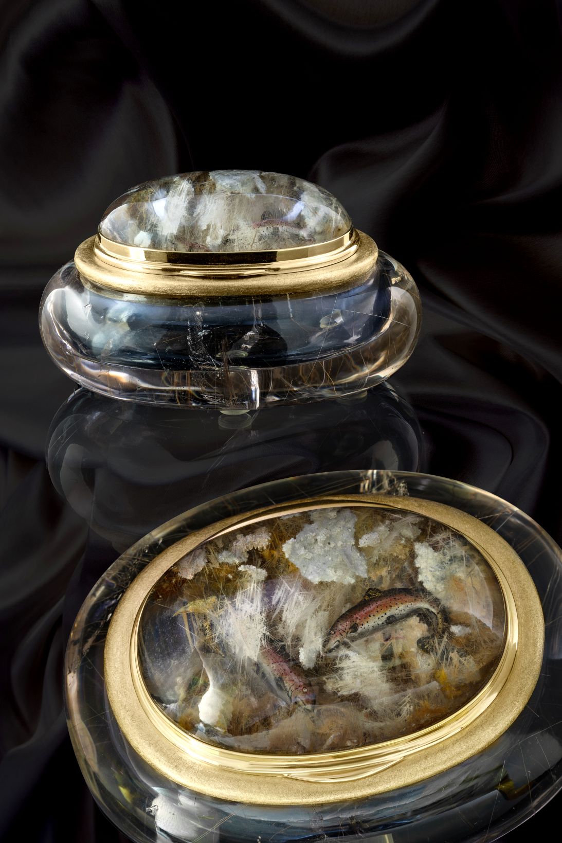 Edelsteindose aus Bergkristall mit Rutileinschlüssen sowie Gelbgold